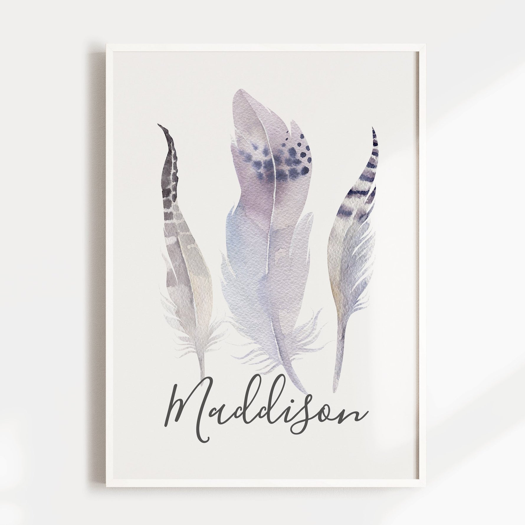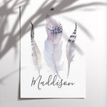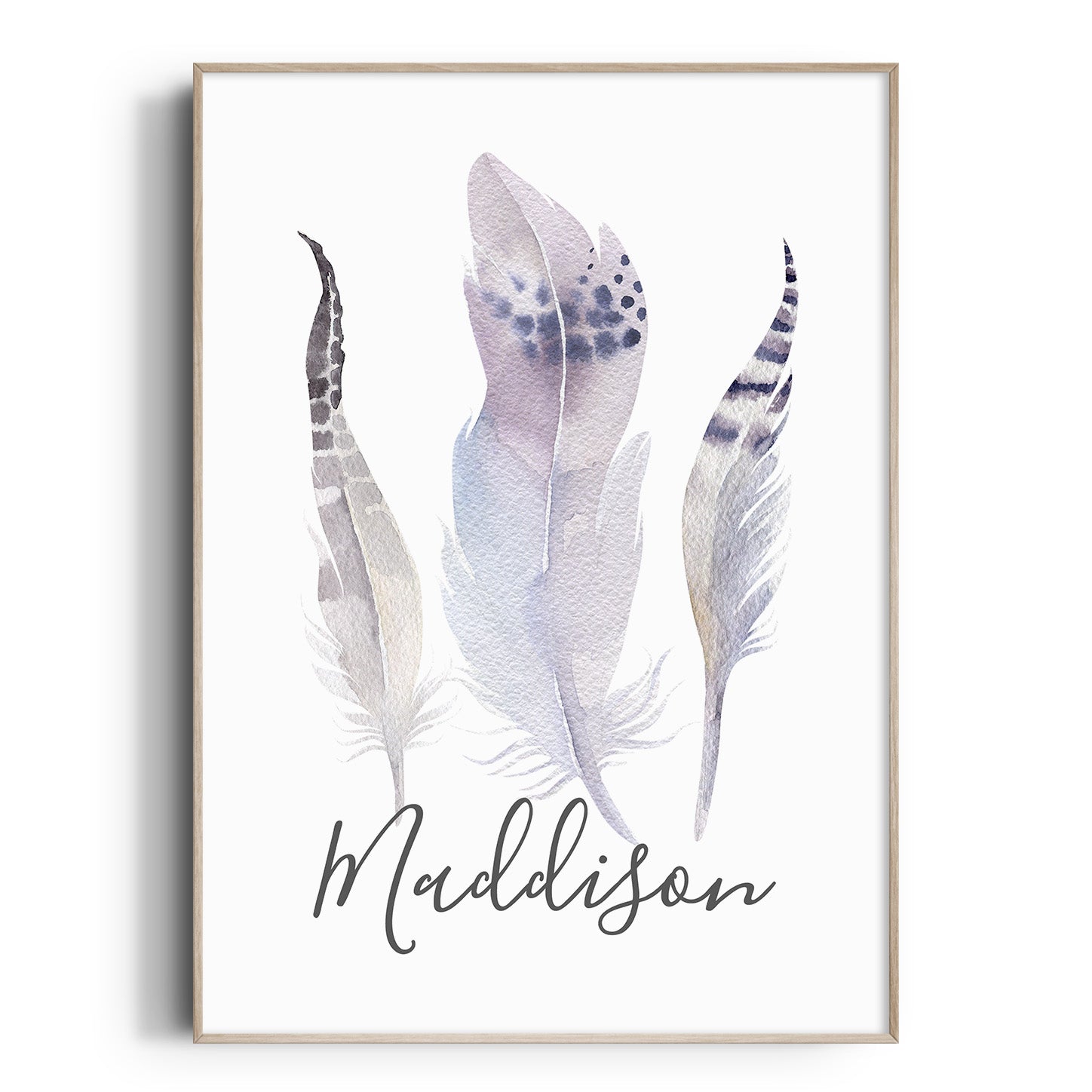 Our personalised Boho Feather wall art print is perfect for your little girls woodland inspired nursery or bedroom decor.  Featuring a soft grey watercolour feather, with hints of purple, your print will be customised with your choice of name.