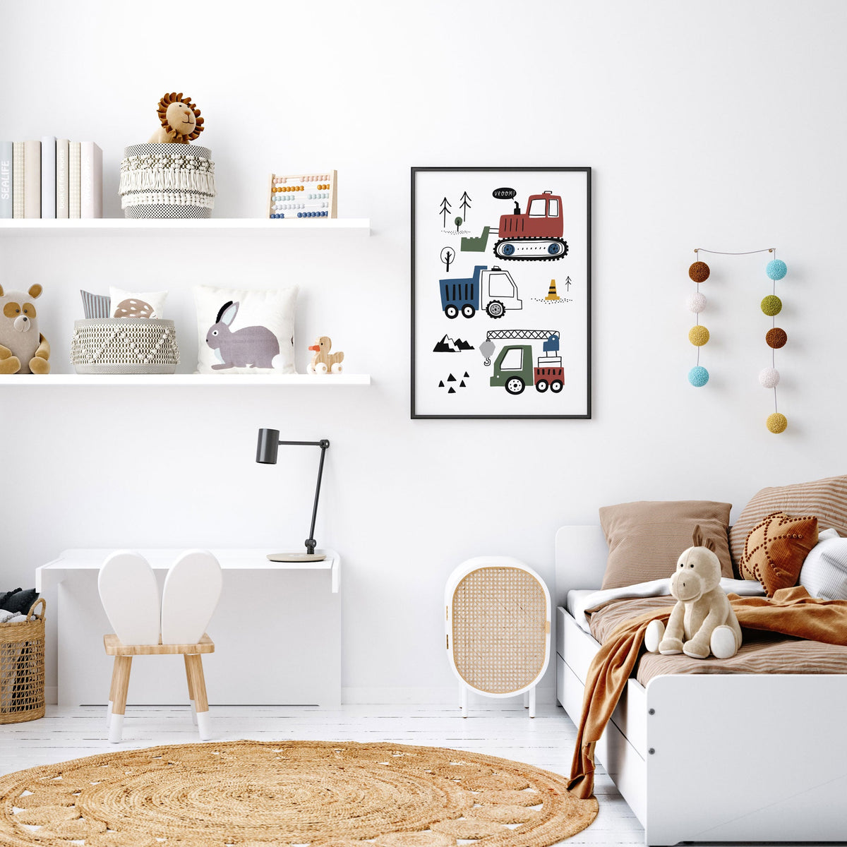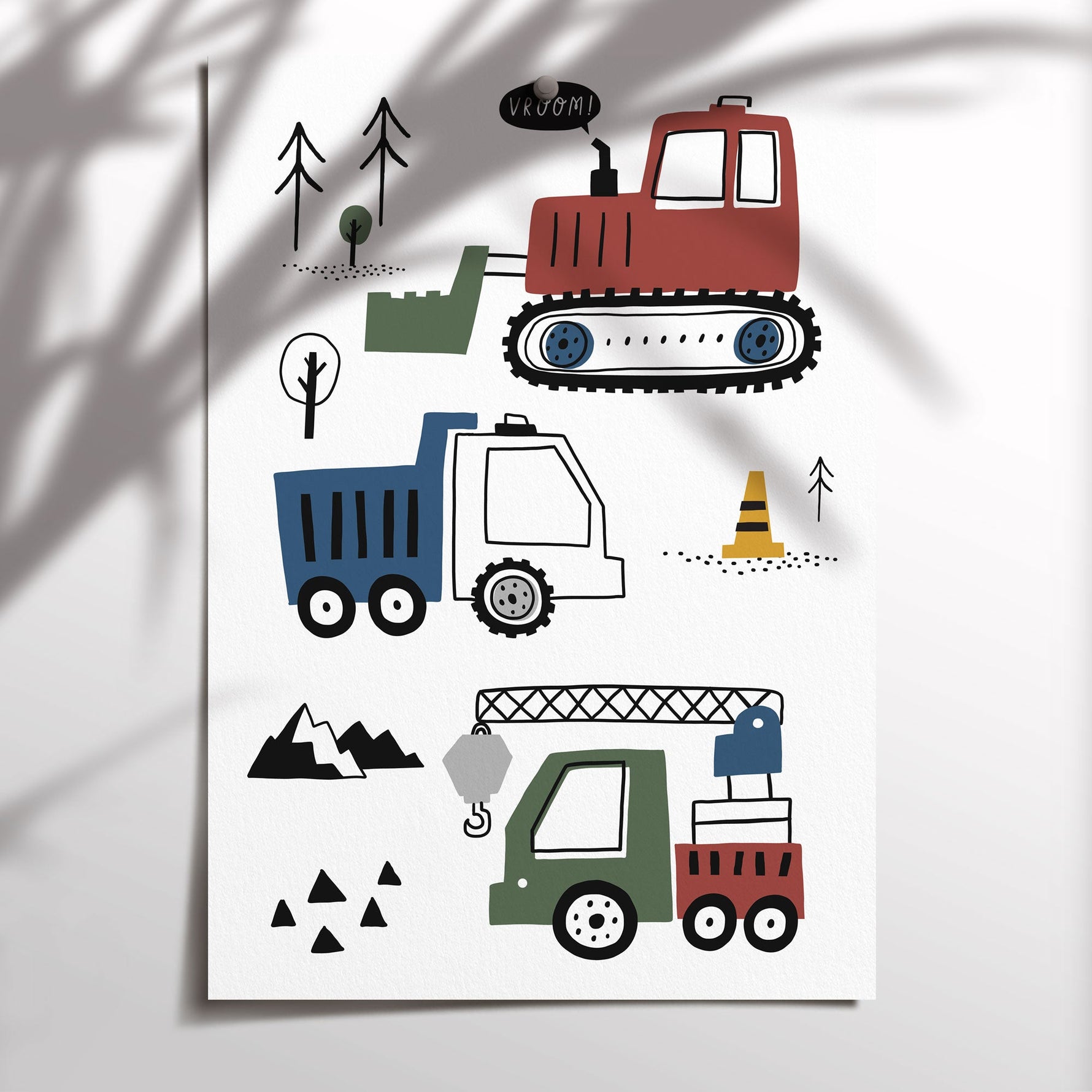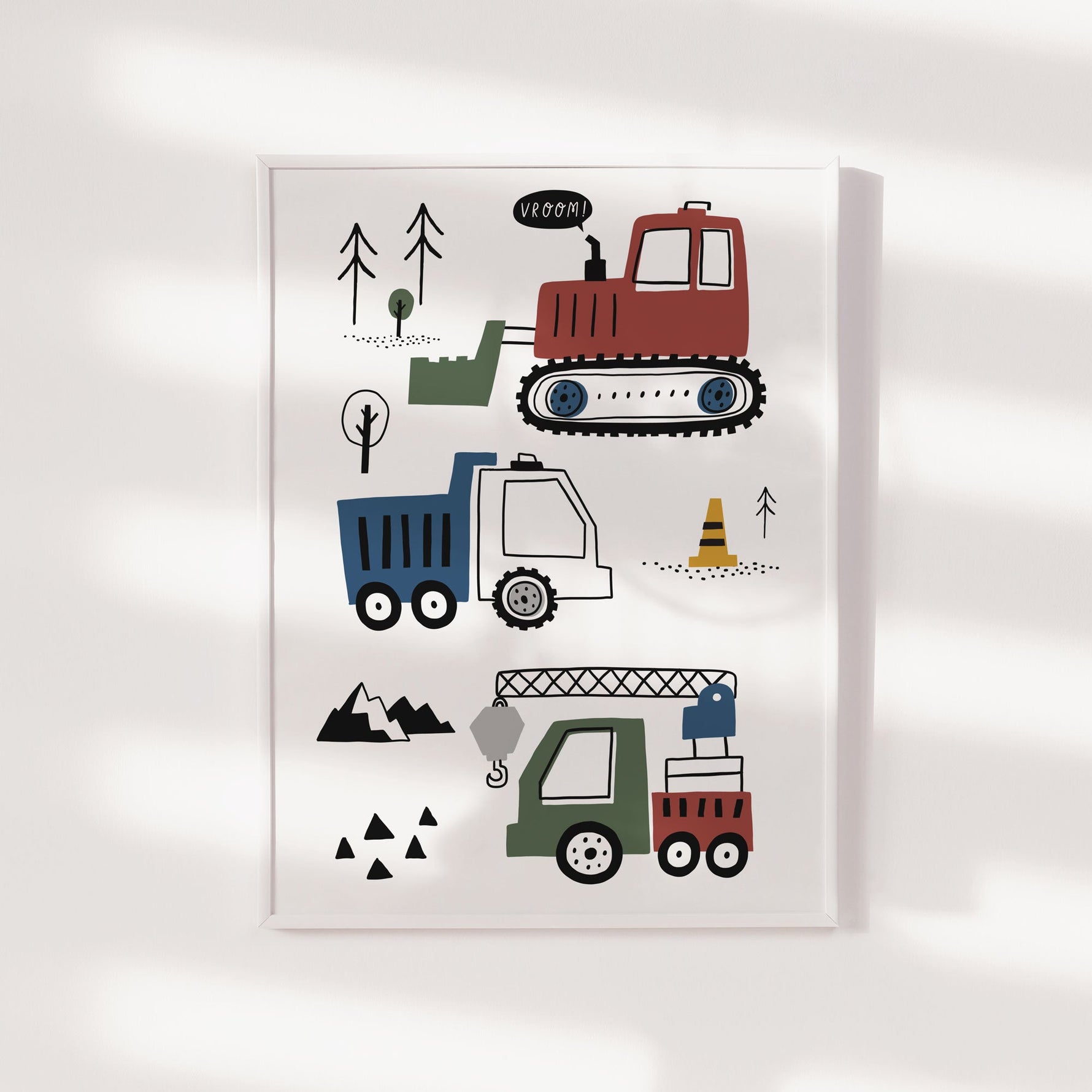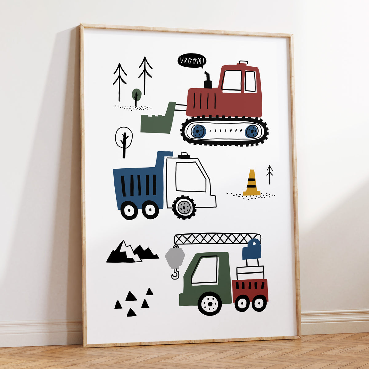 This fun truck construction vehicle art print, featuring a bull dozer, tipper truck, & crane makes a perfect new baby boy gift, or a great way to add the finishing touches to your own child's nursery or bedroom space.