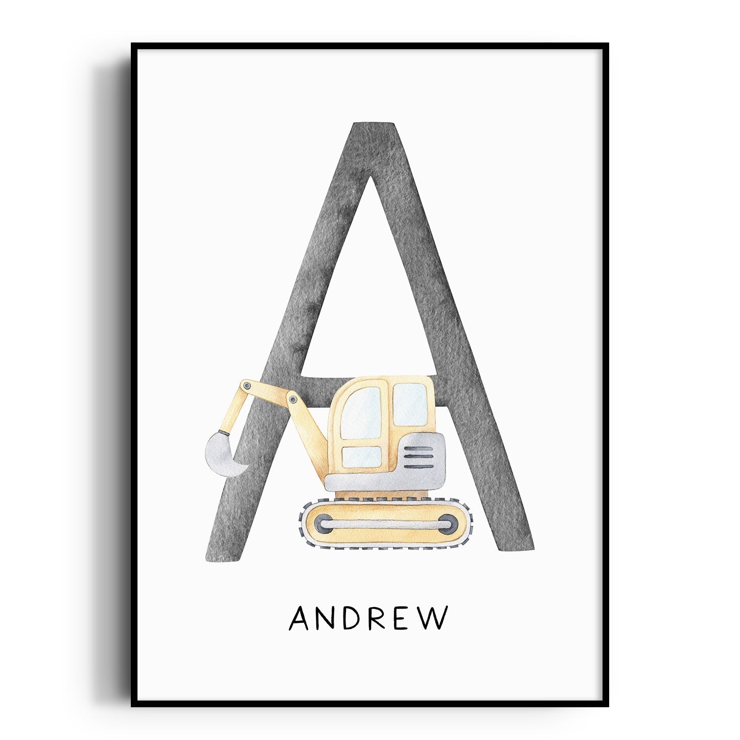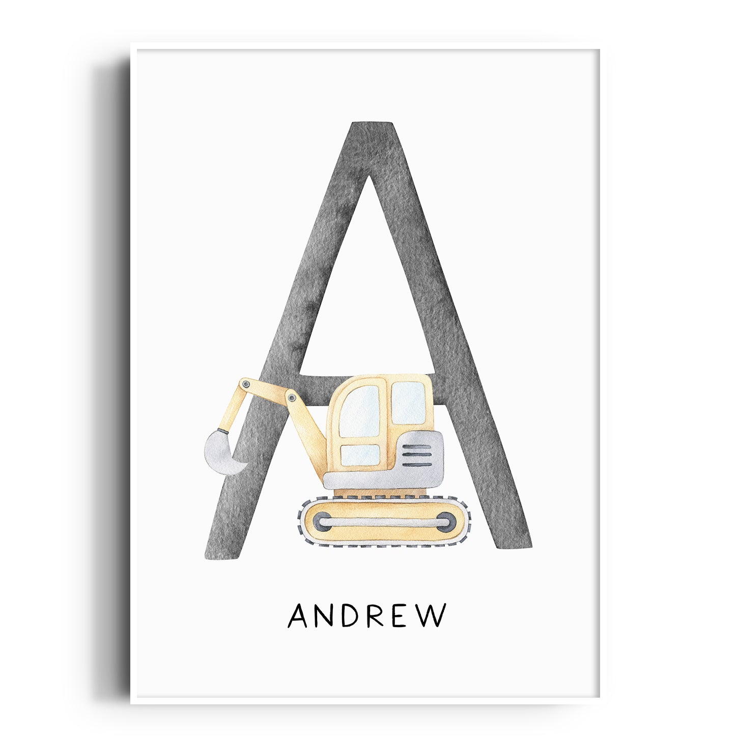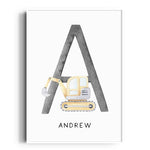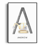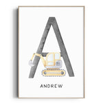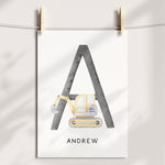 Perfect for the construction, vehicle or truck themed nursery, bedroom or playroom, this digger name print is one's with your little one's details. A perfect new baby boy gift, or a great way to add the finishing touches to your own child's nursery or bedroom space.