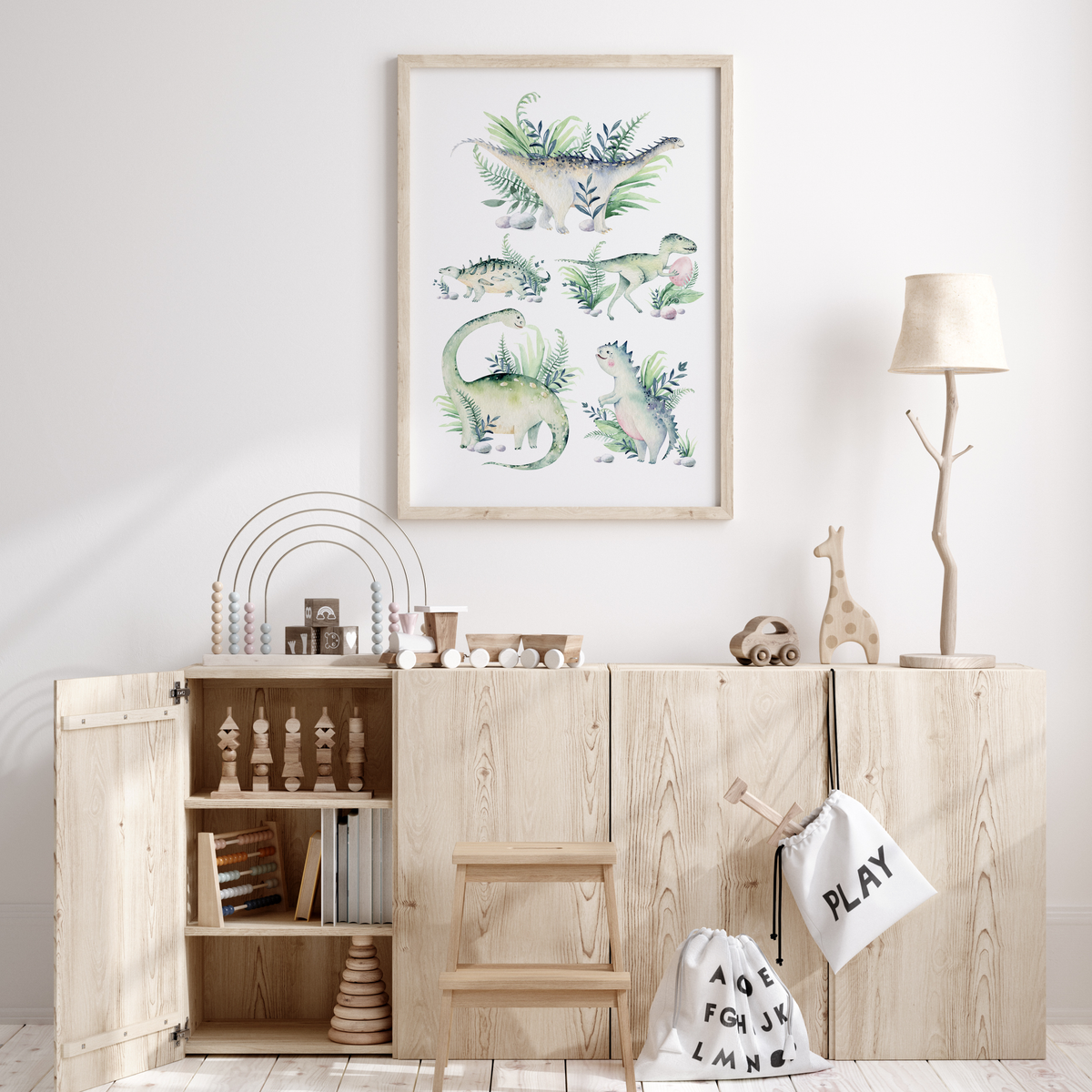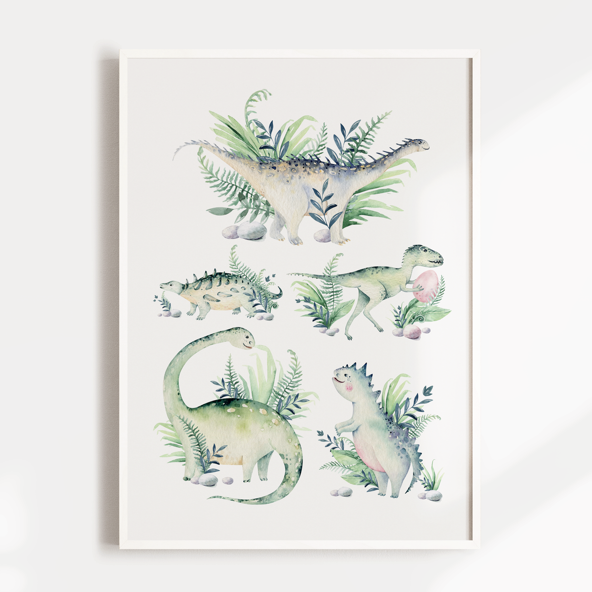 Featuring a collection of dinosaurs, all accentuated with prehistoric greenery, this wall art print will make the perfect addition to your little boys nursery, bedroom or playroom space.